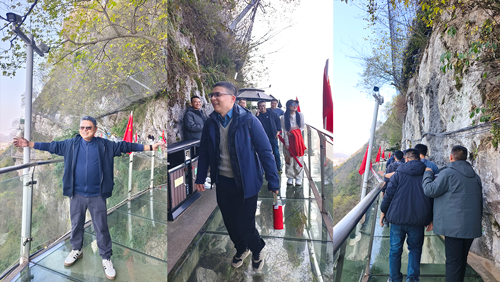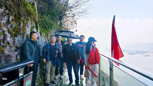 真正的亮点来自鄂东南首条悬崖玻璃栈道,全长1018米,落差220米,透过脚下透明的玻璃,潋滟湖水和连绵群山尽收眼底。同事们或扶肩并行,或勇敢独闯,在惊险中体验着"一览众山小"的壮阔。